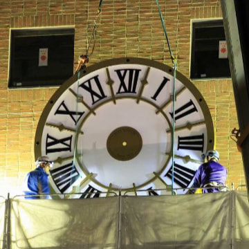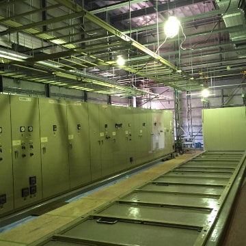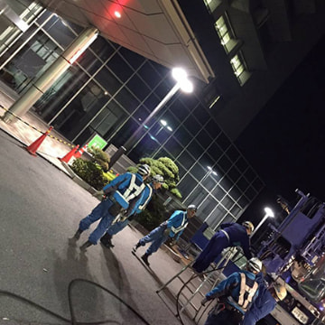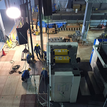 屋内の場合、搬入ステージの設営(足場施工等)をし、重機(クレーン・フォークリフト)にて搬入し機材を使用して横引きし据付いたします。