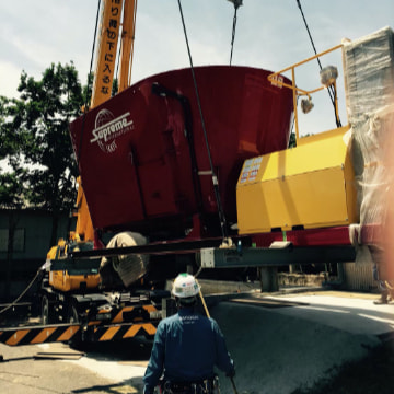 屋外では、重機(クレーン・フォークリフト)にて搬入、必要であれば機材を使用して横引きし据付いたします。